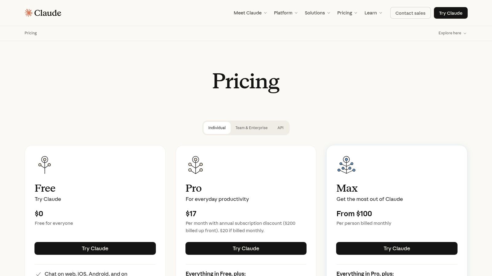 - Pro ($20/month): Five times more usage than the free plan, priority access, and access to the most powerful model, Claude Opus.