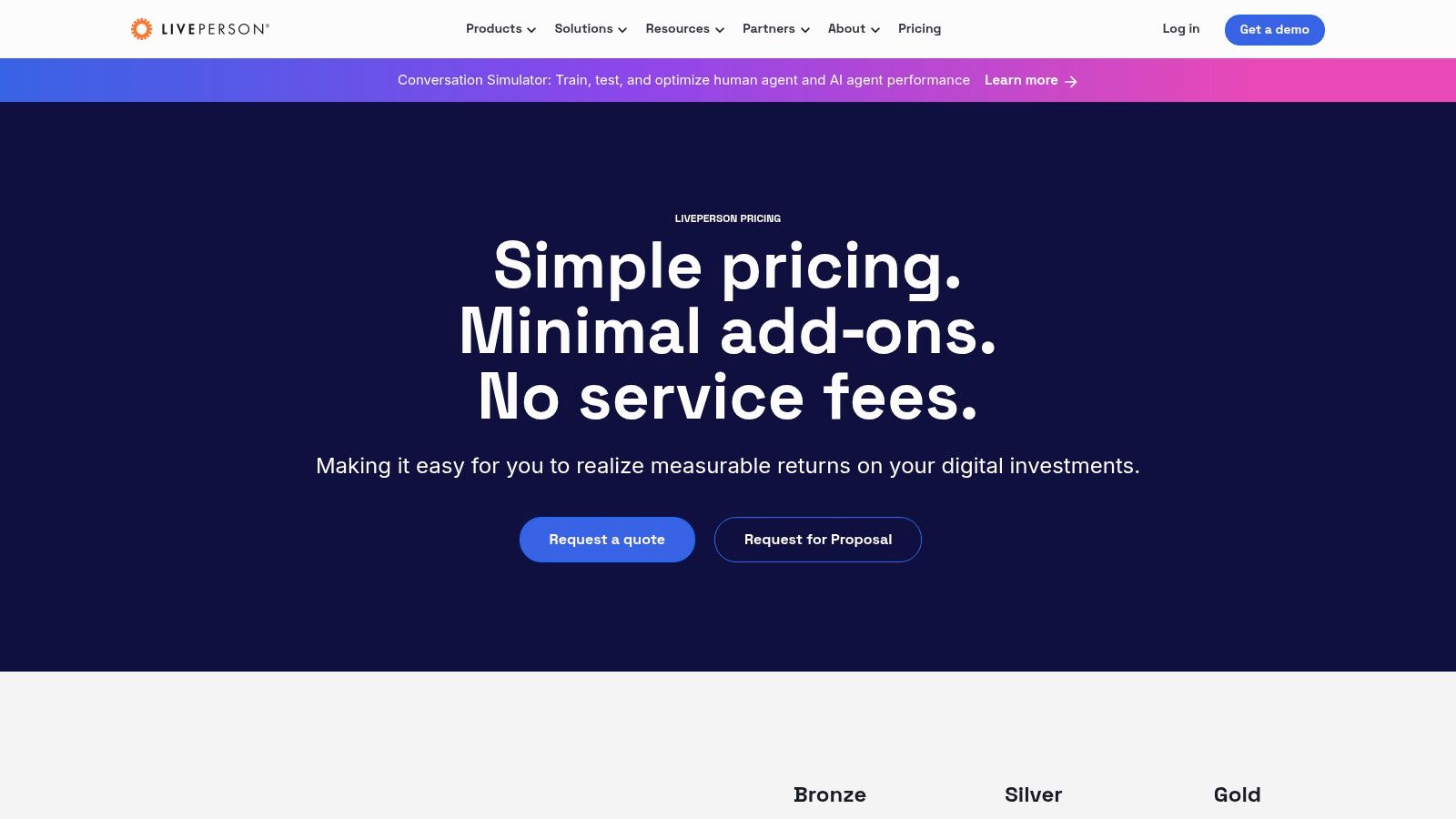 - Pricing: Quote-based. LivePerson offers outcome-focused packaging tiers (Bronze, Silver, Gold), but pricing is not publicly listed and typically requires a consultation to align with specific business goals.