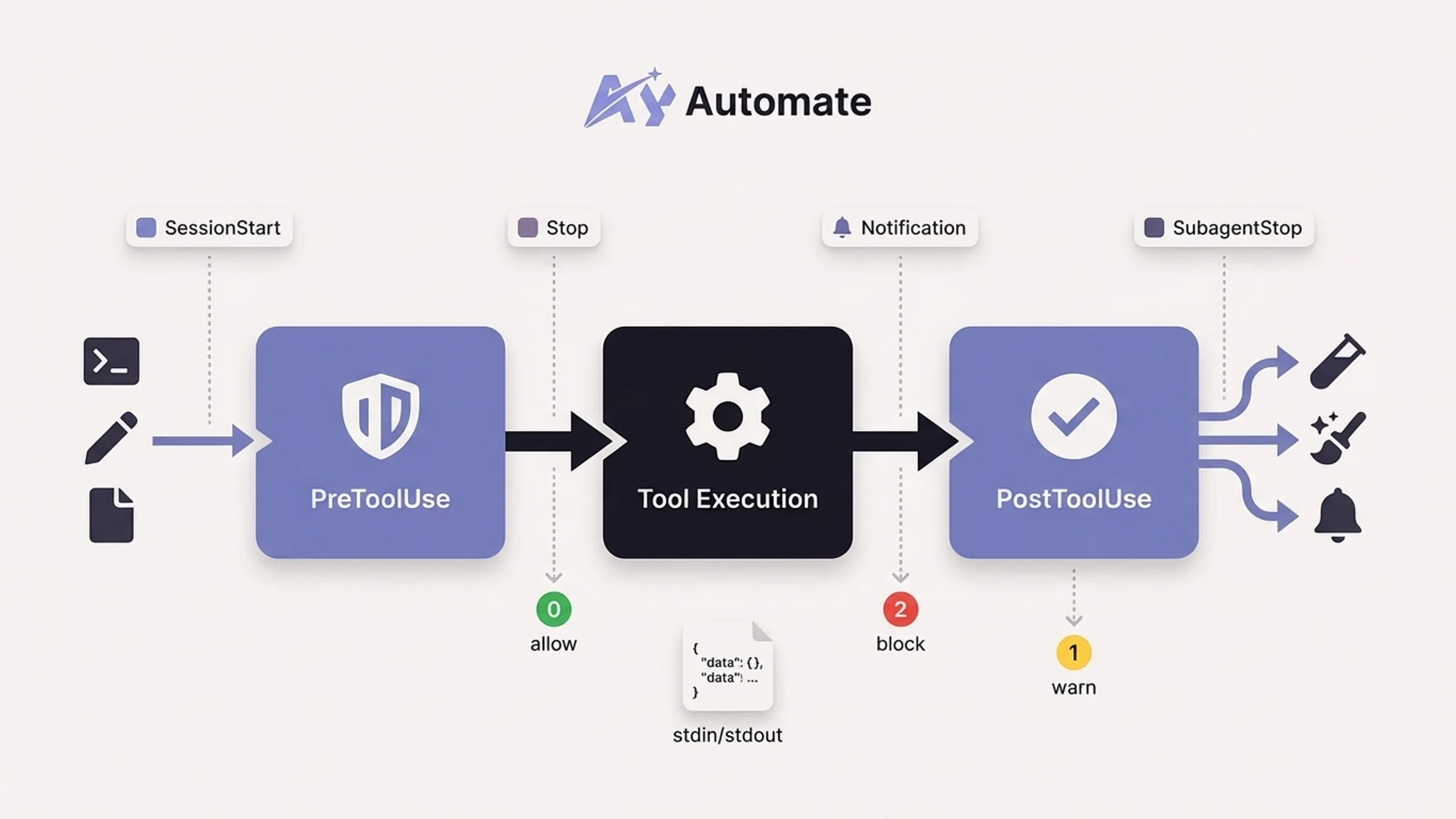 Every hook receives JSON data via stdin with session context and event-specific fields like tool_name, tool_input, and tool_response. Your hook communicates back through exit codes: 0 means allow/success, 2 means block (PreToolUse only), and any other non-zero code signals a non-blocking error.