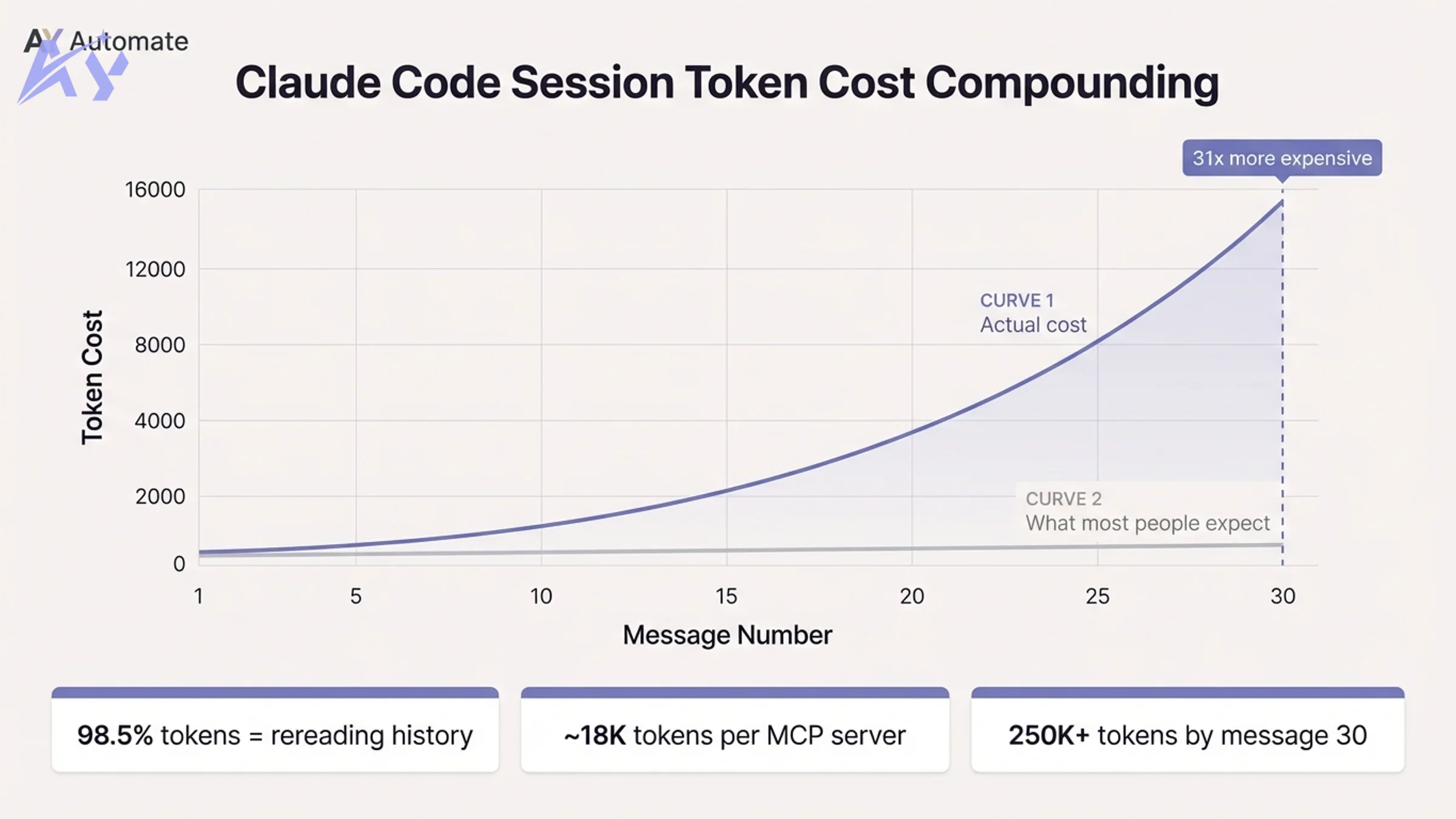 The math is not additive. It is roughly quadratic. After 30 messages, cumulative token spend can hit 250,000 or more in a single session.