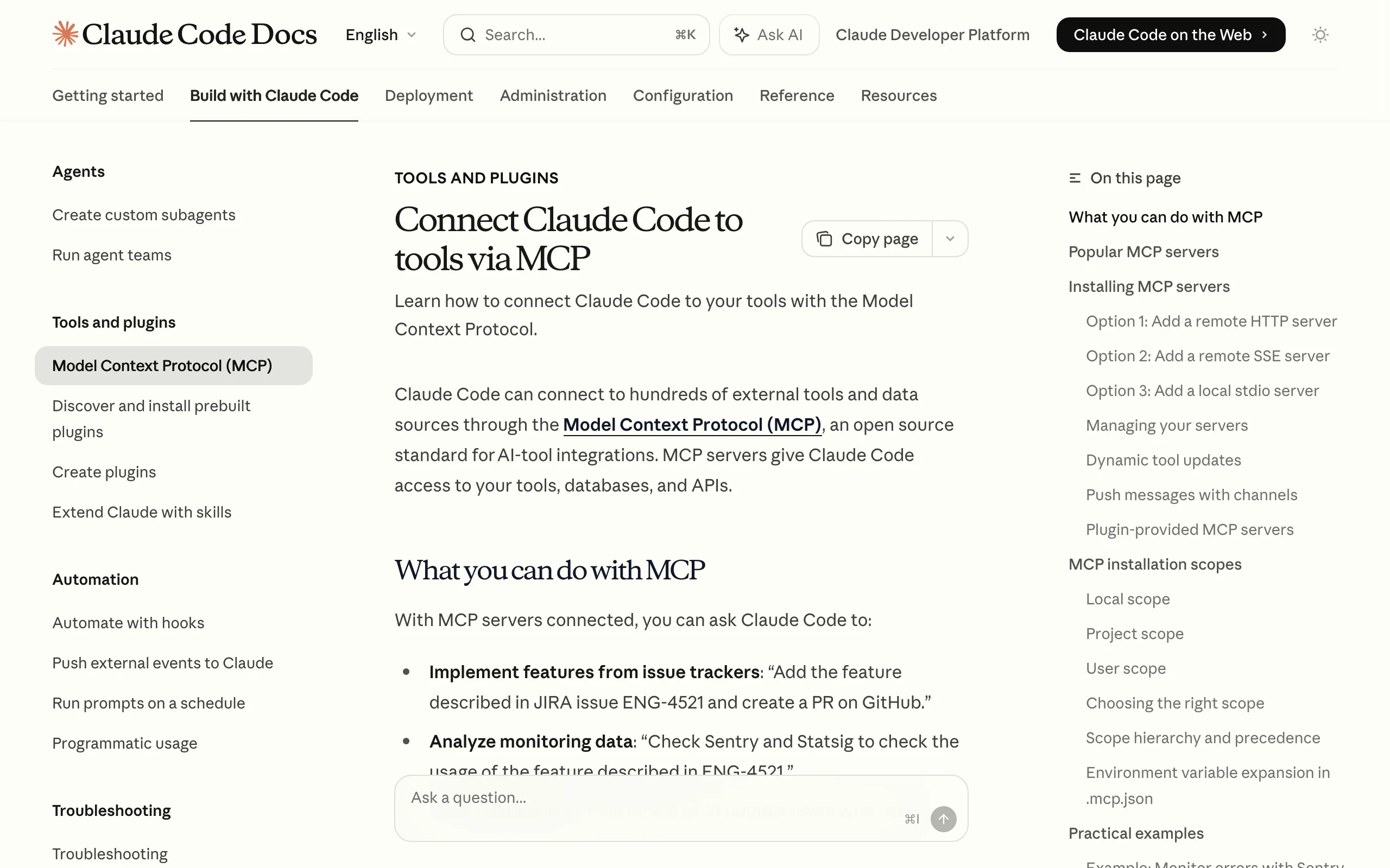 The Model Context Protocol (MCP) lets Claude Code connect to external tools and data sources through MCP server plugins. These servers run as separate processes and expose tools Claude can call during a session. The security model requires you to trust the MCP server author in the same way you trust any code running on your machine.