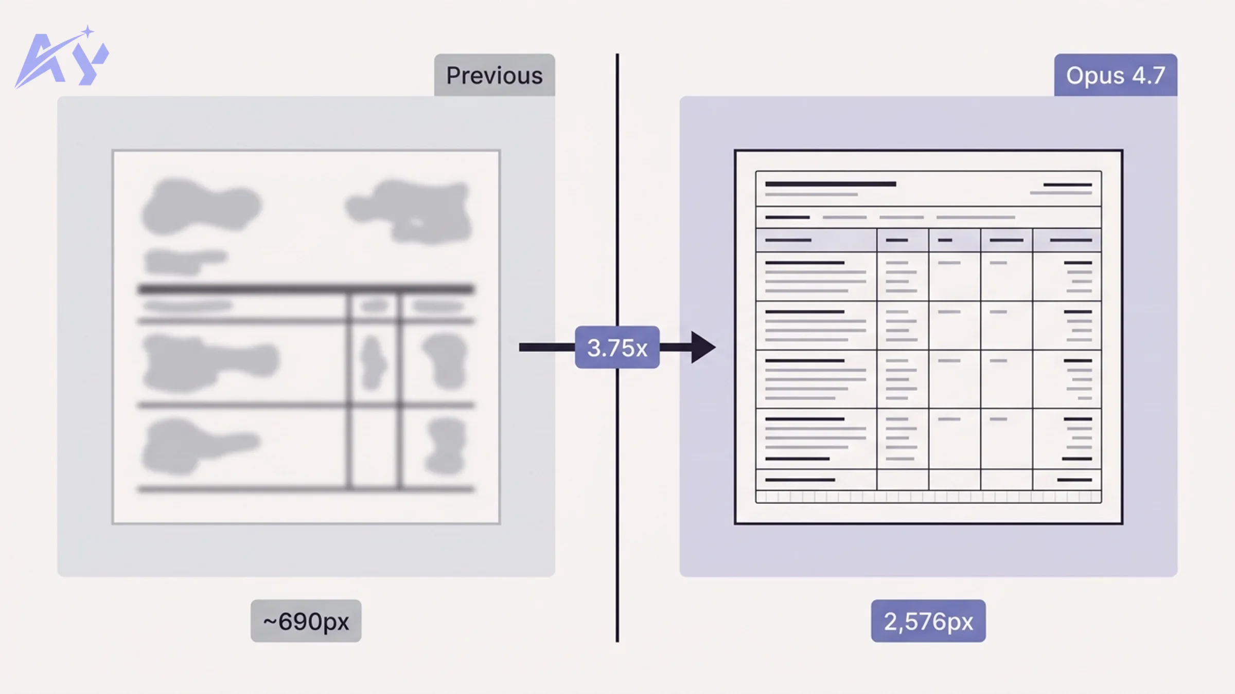 The single most concrete upgrade in Opus 4.7 is vision. The model now processes images at up to 2,576 pixels on the long edge, compared to roughly 690 pixels in Opus 4.6. That is a 3.75x jump in linear resolution and roughly a 14x jump in total pixel area.