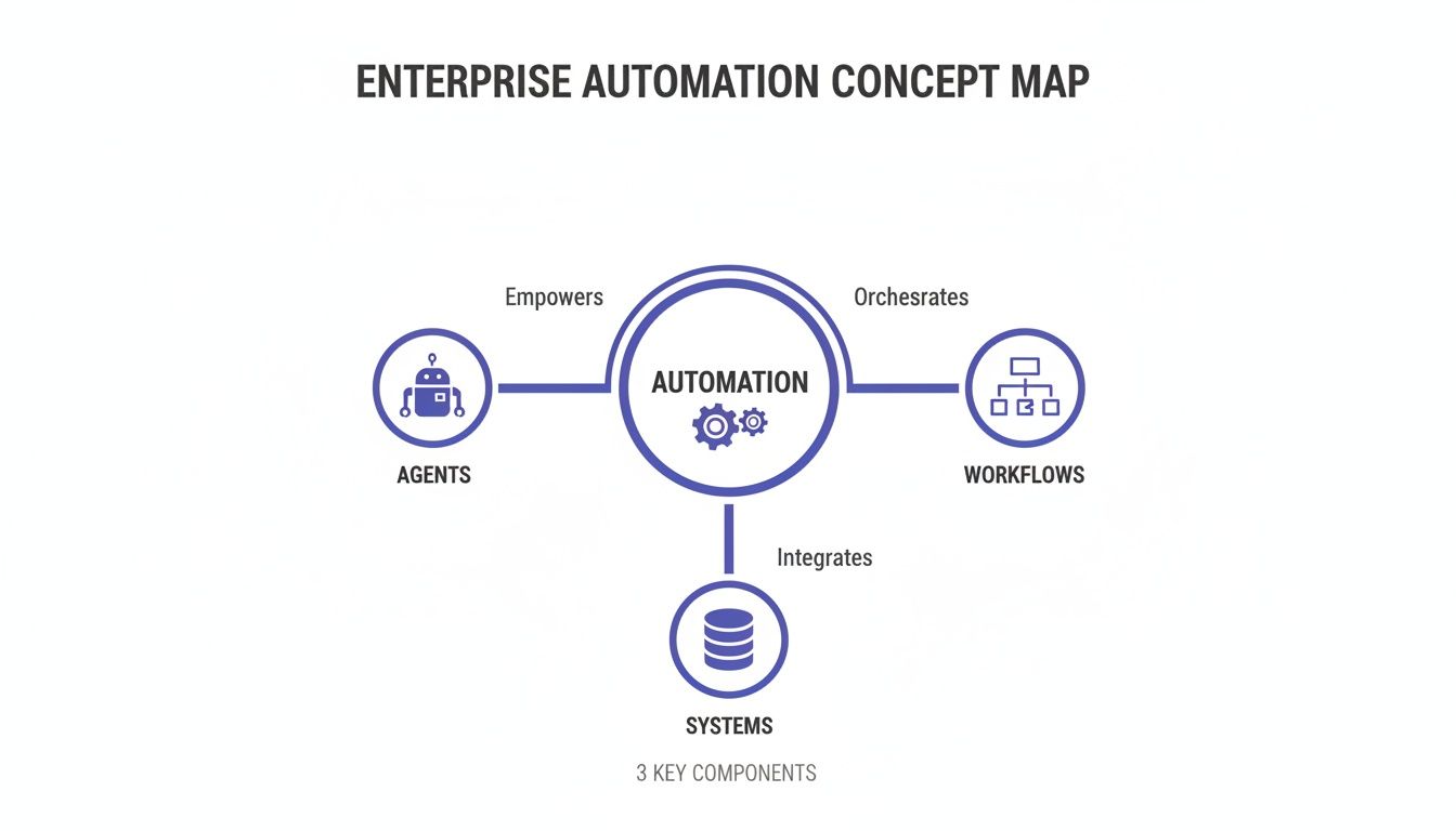 True enterprise automation isn't a single tool—it's an entire ecosystem built for scale. Think of it less like an app you install and more like a fundamental shift in how your organization operates. You're essentially building a digital workforce that runs 24/7, executing complex tasks with perfect accuracy and freeing up your actual team to focus on high-value, strategic work.
