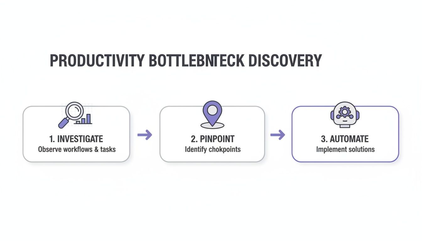 Before you can fire up AI to boost your team's output, you have to play detective. Just throwing automation at a problem without understanding its roots is like paving a road that goes nowhere. It looks like progress, but you’ll end up right where you started. The first move is a deep-dive ‘automation audit’ to find the real points of friction in your team's day-to-day grind.