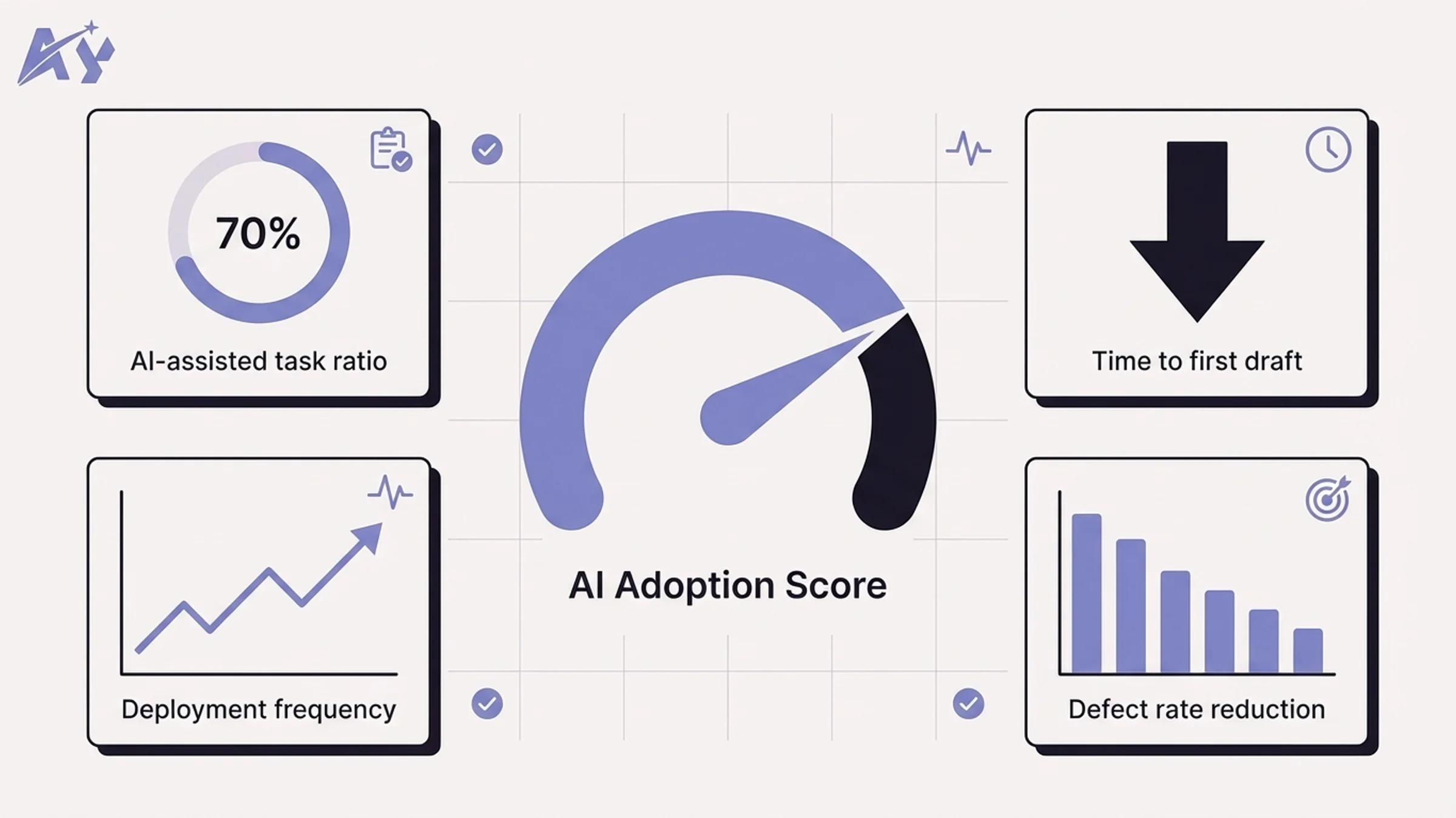 Measure outcomes, not usage. Track time-to-first-draft, code review cycle time, deployment frequency, and defect rates. If the numbers are not improving, your AI adoption is cosmetic, not structural.